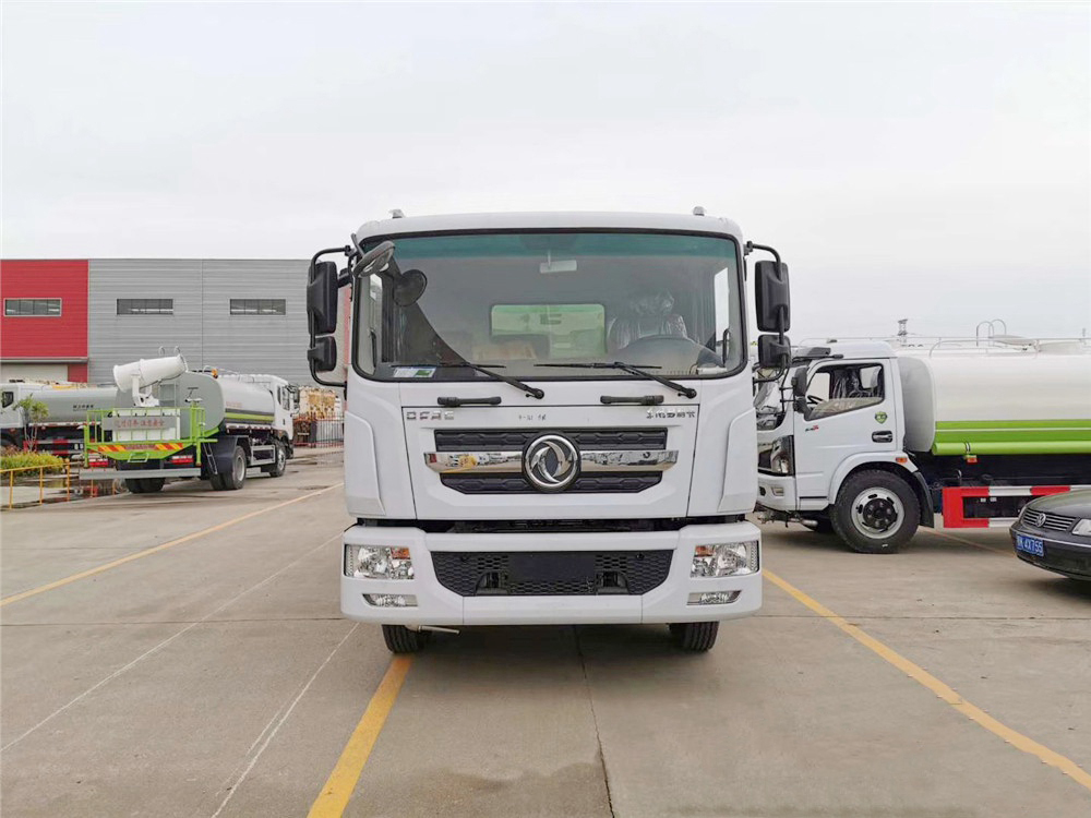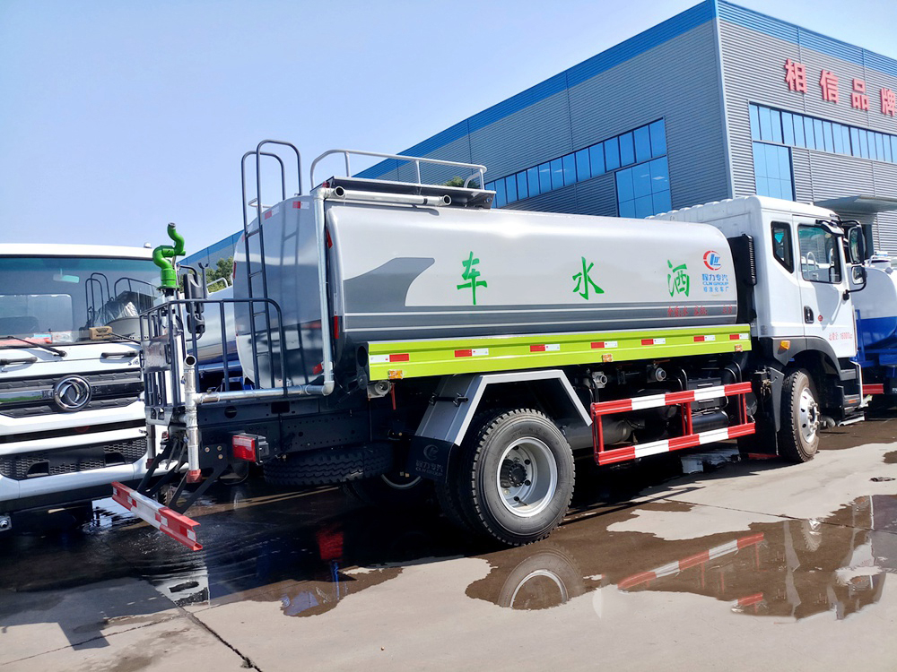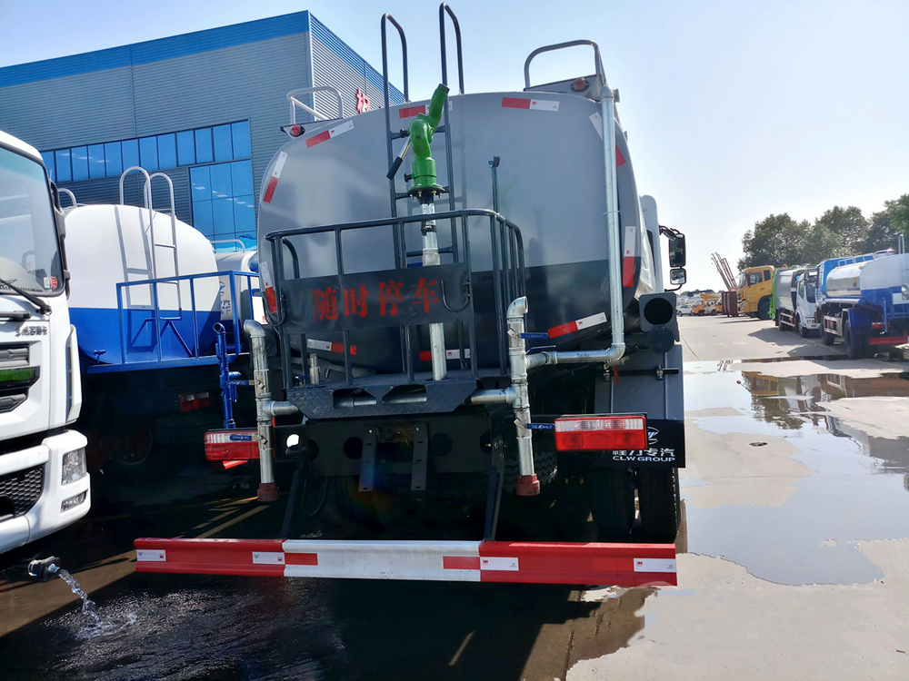 罐体实际容积为12立方米,采用武钢优质碳钢板卷压成型,自动焊接工艺,配备专用高压洒水泵,自吸自排,前喷后洒、侧喷、后工作平台及绿化洒水高压炮。洒水泵自吸高度为垂直7米左右,整车洒水宽度18米左右,后工作平台水炮可调成:直冲状、大雨、中雨、小雨、毛毛雨,有效射程≥35米,整车带接头、水位计,自流阀及自吸功能。后工作平台主管道带1寸浇花接口,附送2根3米水管,1个爬梯,两侧及后保险杠。